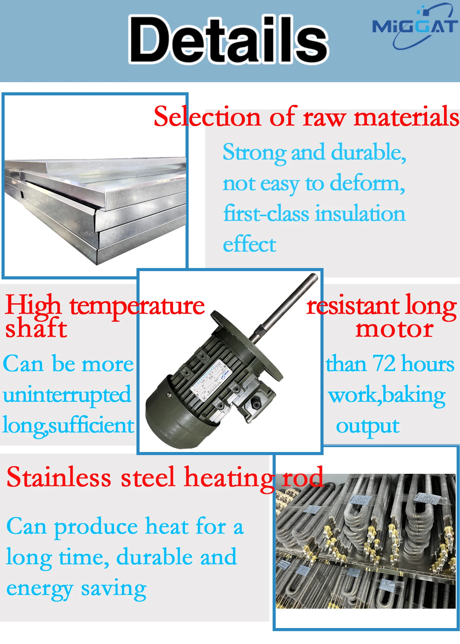 The following table shows the standard oven size of our company. If there is no size that meets the requirements, you cancustomize the size, power, voltage, rack and tray as required.